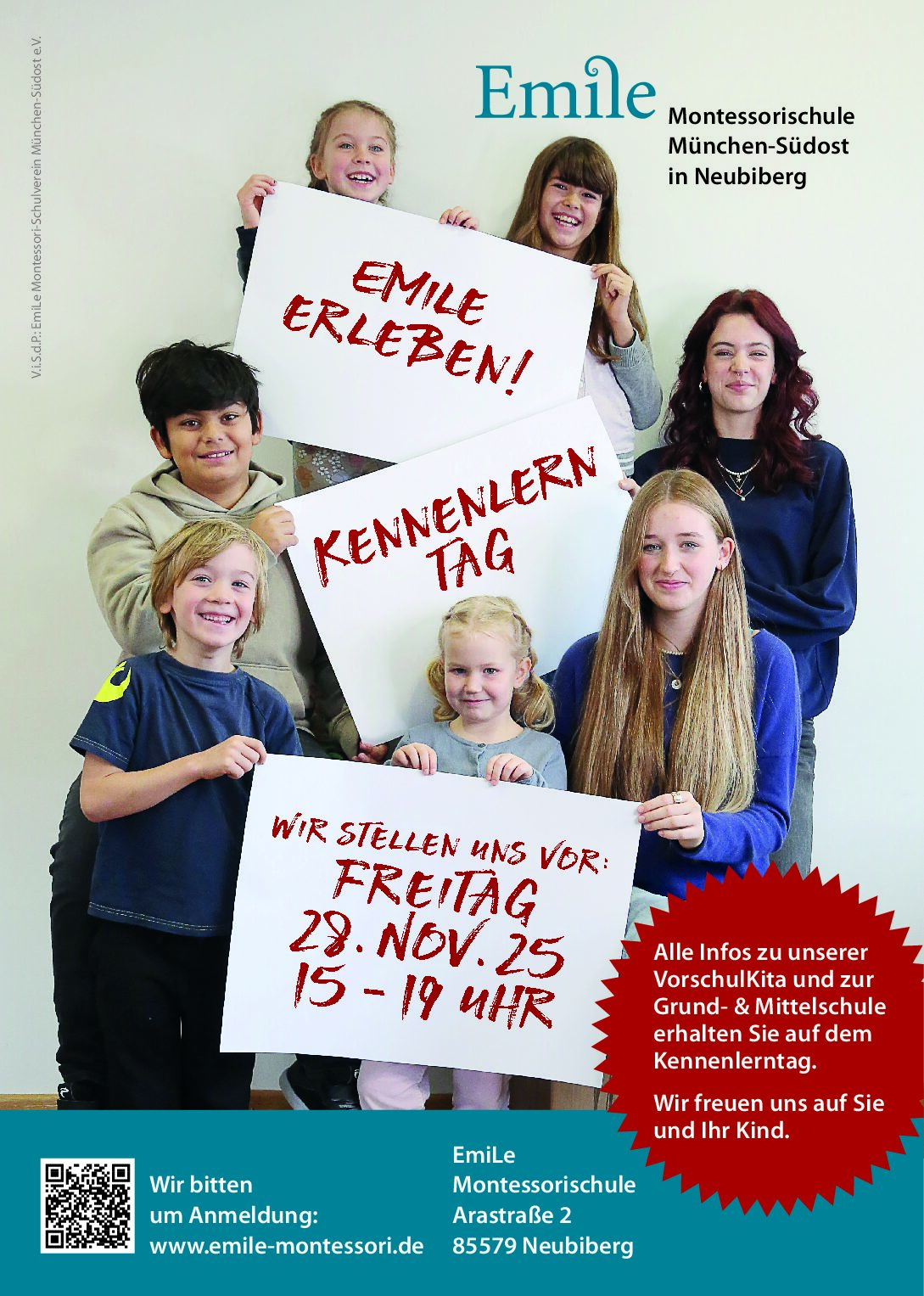 Bei unserem Kennenlerntag am Freitag, 28. November 2025 von 15:00 – 19:00 Uhr können Sie die gesamte Schule und uns als Gemeinschaft persönlich vor Ort kennenlernen. Zudem erhalten Sie einen Einblick in unser pädagogisches Konzept und können sich mit unserer Montessori-Arbeitsweise vertraut machen. Auf (fast) alle Ihre Fragen werden Sie hier eine Antwort finden. Bei unseren Hausführungen lernen Sie die Räumlichkeiten kennen und können zudem an einer kurzen Darbietung teilnehmen (Kurzvorträge zur Arbeitsweise an der EmiLe und Vorstellung unseres Montessorimaterials u.v.m.).